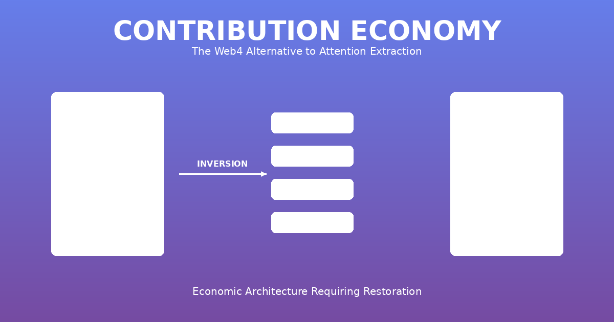 The contribution economy begins where the attention economy ends — but not by evolution. By inversion. By replacing the economic foundation so completely that the old incentives become obsolete.